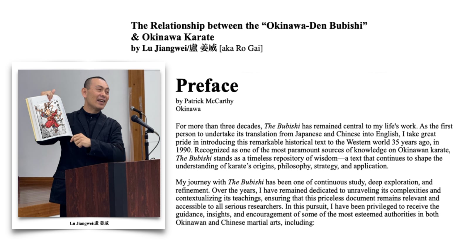 About the Speaker Lu Jiangwei (盧 姜威) — also known as Ro Sift — holds a Doctorate in Arts (Okinawa Karate) from the Graduate School of the Okinawa Prefectural University of Arts. He also studied at the University of the Ryukyus and Okinawa University. Originally from Fuzhou, Fujian Province, China, he now resides in Naha, Okinawa.